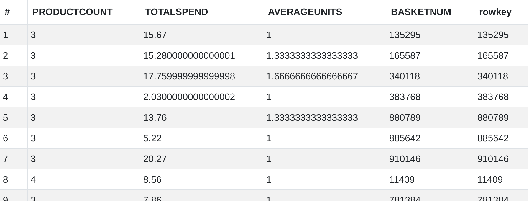 | BasketNum | Integer | The same as the basketnum in transactions, for each record in the transactions data set there is a record in customers with a matching basketnum |