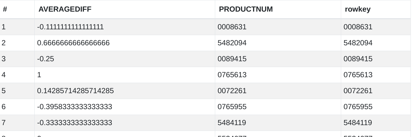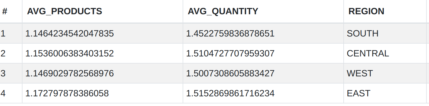 Like in a relational database, the output from one query can be used as the input in another one. The following query investigates differences in quantity purchased per transaction for each productnum between the CENTRAL and SOUTH stores.