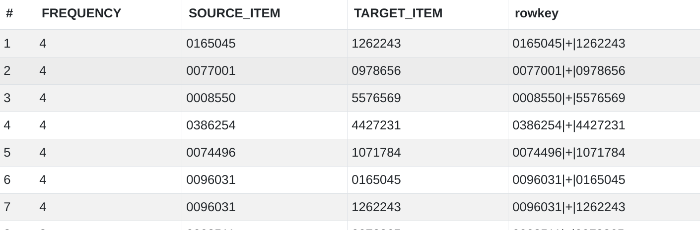 Burroughs supports selj-joins, something that is not inherently supported by KsqlDB. The below example uses a self-join to find the frequency with with certain combinations of items appear in the same basket.