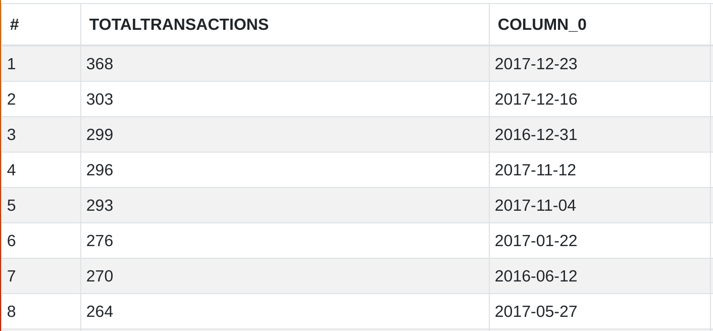 Burroughs, like its dependencies Avro and KsqlDB, does not support any kind of date data type. Instead, dates must be stored as integers representing the number of days since the epoch. Such dates are not human readable, so Burroughs provides the ability to turn those into normal date strings using the cast function as shown in the following query which counts the total number of transactions that occur on each day.